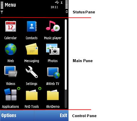 Windows and panes use the Symbian application and UI frameworks. For implementation information, see Application and UI framework implementation considerations.