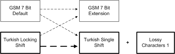 • Turkish Locking Single Converter. The highlighted boxes in Figure 3 show that it supports the Turkish locking shift alphabet, Turkish single shift alphabet and the set of lossy conversions supported by the standard converter. This converter is identified by the KCharacterSetIdentifierTurkishLockingAndSingleSms7Bit UID, which is defined in the charconv.h header file.