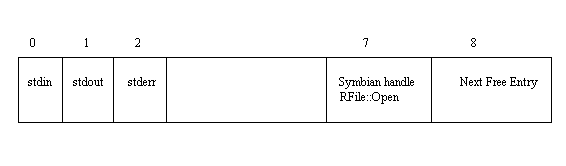 The porting of the 'C' POSIX fopen() function, below, is a good example of mapping POSIX handles to native Symbian platform resource objects. The mapping is done through a file descriptor table. As a reminder, every application/process has its own file descriptor table.