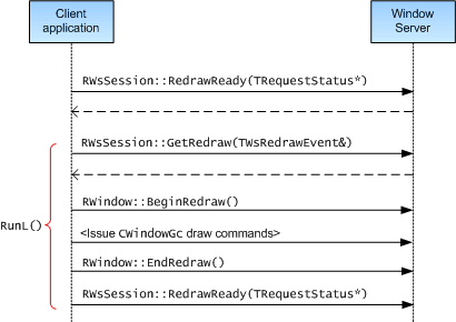 The following diagram demonstrates that typically the RunL() starts with a GetRedraw() and ends with a call to RedrawReady().
