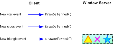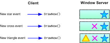 To illustrate how it works, consider a window that has a rectangle that is used to display icons (a star, a cross and a triangle) that represent three different events that can occur in the application. Suppose the events can occur in quick succession. If you use the "draw now" approach when each event occurs, the Window Server updates the display separately for each one, as shown in the following diagram.