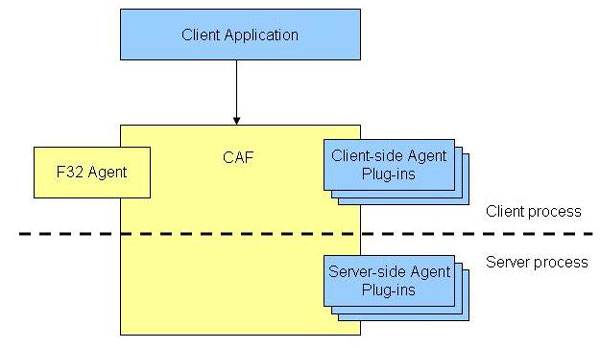 CAF uses a client-server architecture. The CAF client DLL must be linked with the client process. CAF agents can be implemented as plug-ins to the CAF client if they do not require access to keys or rights. An agent requiring access to encryption or decryption of keys, or rights must be implemented as a server-side plug-in. A server side plug-in must ensure that only applications with the right capabilities can access the content.
