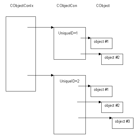 For example, the sever creates a single object container index; from this it creates a number of object containers, each of which, in turn, holds reference counting objects. The following drawing shows the idea.