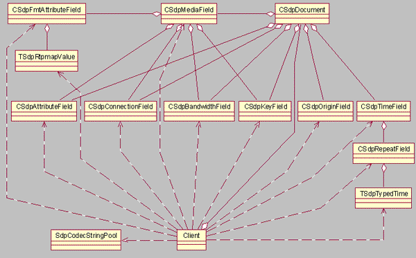 The client uses some or all the SDP Codec API classes during the handling of a SDP description. The interface classes are derived from CBase. The client has a 'use' relationship with the SDP Codec API library.
