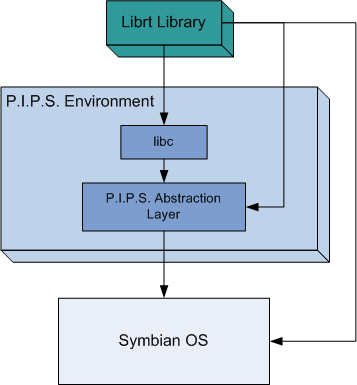 The following image illustrates how the Librt library interacts with the components of the P.I.P.S. environment and also with the Symbian platform: