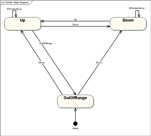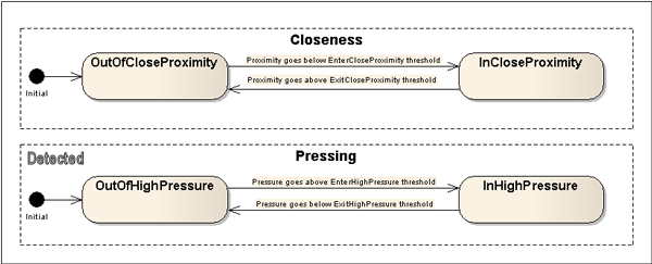 The following diagram shows the extension of the Up and Down states with additional substates. Up is extended with substates describing the closeness of the pointer to the screen. Down is extended with substates describing pressing.
