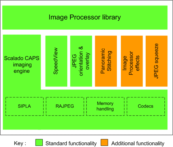 The diagram below shows the standard and the additional functionality within the Image Processor library.