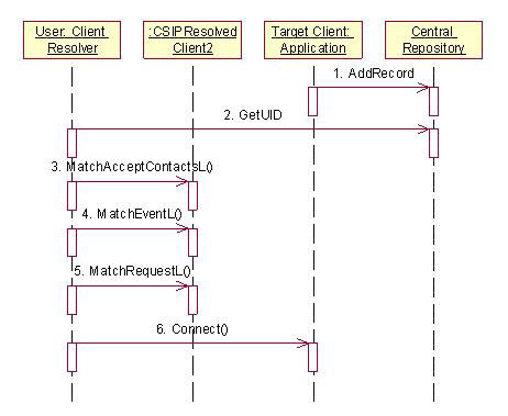 If a match is found, the related ECOM plug-in is loaded by its UID. The loaded plug-in matches the incoming SIP requests based on their fields. If the request matches, the plug-in returns the UID of the matching client. SIP Client Resolver requests the resolved ECom plug-in to connect to the Symbian platform server that uses SIP.
