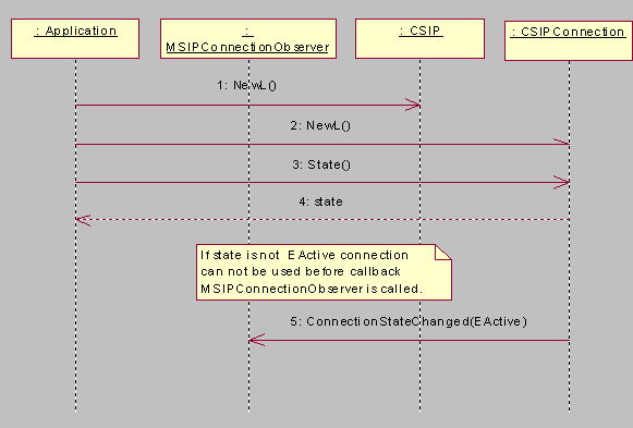 Call the CSIPConnection::NewL() function to create an active connection. The CSIPConnection::EActive state indicates that the object can be used to send SIP messages and create registrations and dialogs. The current state is asked by calling CSIPConnection::State(). The MSIPConnectionObserver::ConnectionStateChanged(CSIPConnection::