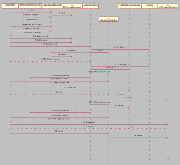 Note: SendRequestL() starts the server side processing of sending the MESSAGE request. This task takes time as address resolving and socket operations are done only after the SendRequestL() call is returned. If an error occurs after SendRequestL() returns, then the error is communicated to the application through one of the MSIPConnectionObserver::ErrorOccured() callback functions. An example of such a failure is failure to resolve the address. When SendRequestL() returns, the MESSAGE request is not yet sent to the network, and is being processed on the server side of the SIP stack.