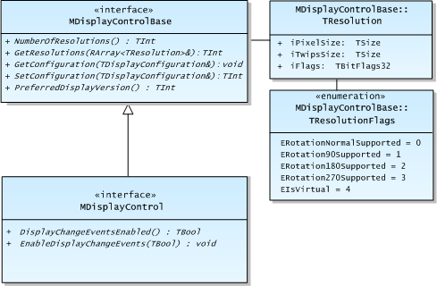 The MDisplayControl interface provides Window Server clients with functions for setting and getting the current display configuration, getting a list of available resolutions and enabling display change event notifications (EEventDisplayChanged). The following diagram shows the class hierarchy.