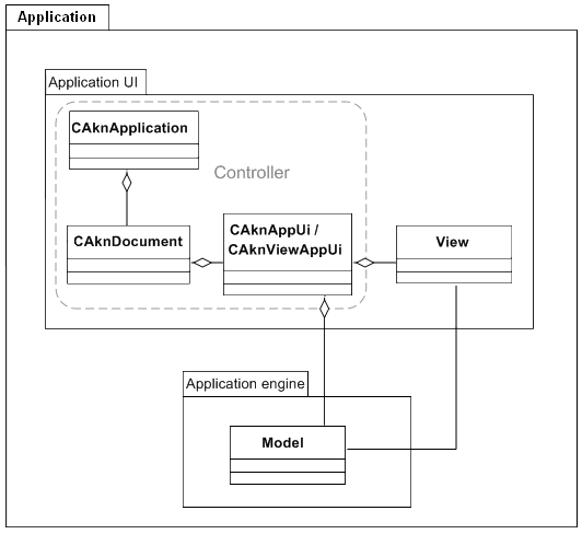 requires the implementation of CAknApplication and CAknDocument derived classes.