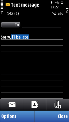 A longer stretch of text can be selected by using the Hash key (#) and keeping it pressed while using the Arrow keys. The selected text is highlighted and the Cut and Copy functions are available on the softkeys when some text has been selected. It is also possible to start selections by going to the Options menu and selecting Copy mode.