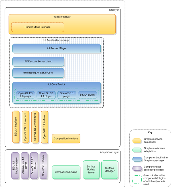 Symbian provides more than one render stage solution. The following diagram provides a simplified representation of one possible solution (called solution A in this topic). This solution is full featured. The diagram focuses on the more relevant components and does not attempt to show all components in the complete solution. This solution has a dependency on the S60 middleware layer, in particular on the Hitchcock component (which is in the UI Accelerator package).