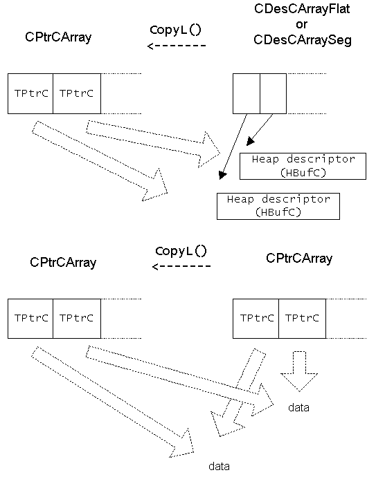 The implementation of the copy does not and cannot depend on the type of the source descriptor array,that is, whether it is a CPtrCArray type or a CDesCArray type. However, the following diagram shows the effect of the copy operation based on the concrete type of the source array.