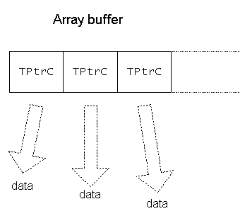 When using an array of non-modifiable pointer descriptors, the data represented by each TPtrC exists independently of the TPtrC itself. The memory required by the array is that required to contain the TPtrC elements. The data represented by the TPtrC descriptors is not copied or moved. On the other hand, that same data must be guaranteed to remain in memory if the array is to have any purpose.