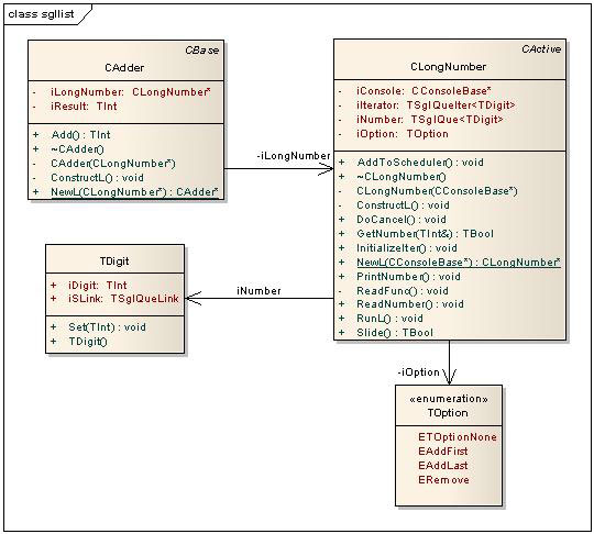 The example creates a singly linked list of objects of the TDigit class. This list represents a long number. An object