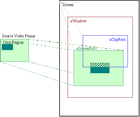 A crop region is defined as a region in the source video frame. The cropped region is displayed in the center of the ScreenRect with the same scaling as if it was displayed as part of the whole image. This could be used to zoom in on a region by setting the crop region, and setting the scale factor to fill the WindowRect.